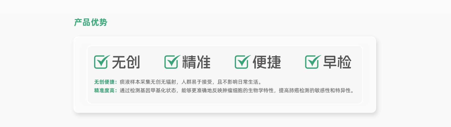 會(huì)安心?人類HOXB4、SRCIN1基因甲基化檢測(cè)試劑盒(熒光PCR法)于2025年5月29日正式獲批上市,這是首個(gè)痰液肺癌甲基化檢測(cè)試劑盒。 會(huì)安心?通過解讀痰液中脫落腫瘤細(xì)胞的基因異常改變(人類HOXB4、SRCIN1基因甲基化)進(jìn)行肺癌的早期檢測(cè),幫助發(fā)現(xiàn)患者早期肺癌病變情 況, 有希望將肺癌阻斷在早期階段,從而達(dá)到提前預(yù)防和治療肺癌的目的。