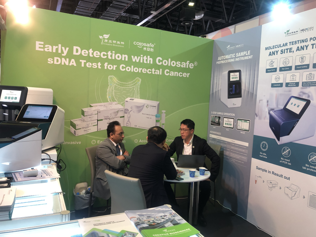 展會(huì)上,康立明生物創(chuàng)始人、腸癌早篩技術(shù)發(fā)明人鄒鴻志博士親臨現(xiàn)場(chǎng),并帶領(lǐng)專業(yè)團(tuán)隊(duì)為多方客戶熱情專業(yè)的講解,共同交流,洽談合作。并介紹了長(zhǎng)安心®目前在國(guó)內(nèi)568051例應(yīng)用檢測(cè)(截至2022年12月31日)的成功模式與經(jīng)驗(yàn)。